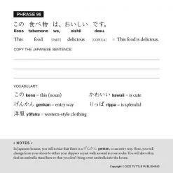 Each tear-out sheet introduces a common Japanese phrase in bold, easy-to-read type, along with the pronunciation and meaning in English. Plus, language learners can use the provided practice boxes to try writing the phrase themselves! Cultural notes are provided on the back along with etiquette tips on when and how to use the phrase.